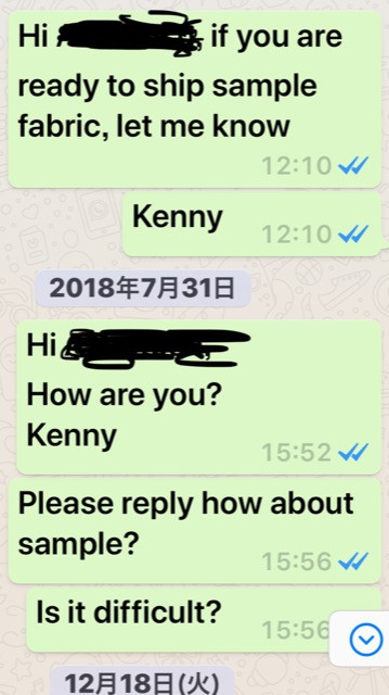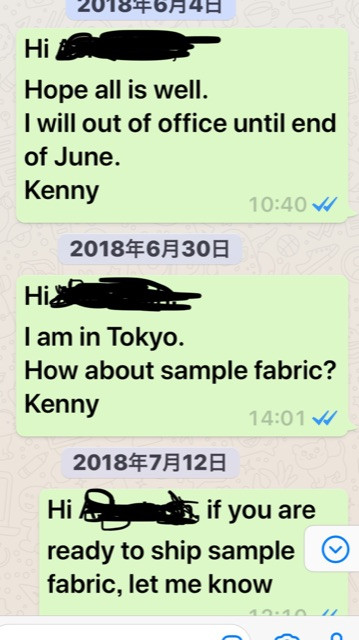 帰国後、東京にいることをお知らせしつつ、サンプル生地の発送を待つ。既読、返信無し。